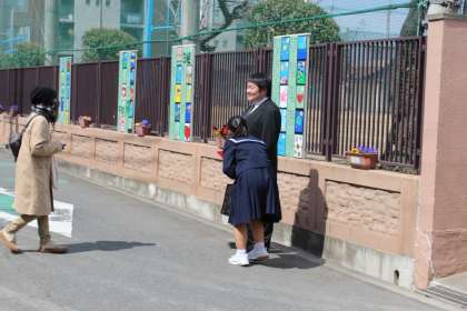 その間に教職員と在校生と保護者の方とで花道を作りました。