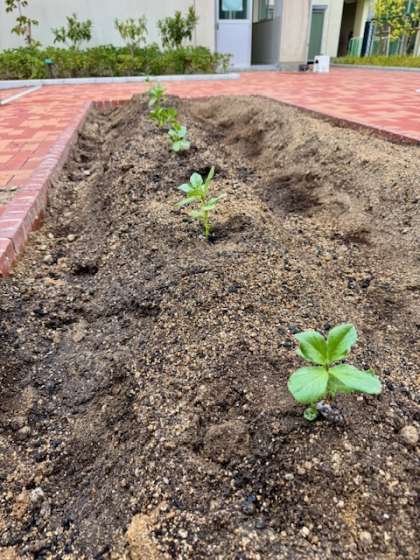 そら豆の種を育苗ポットで育て、発芽し苗に成長したものを畑に植え替えました。