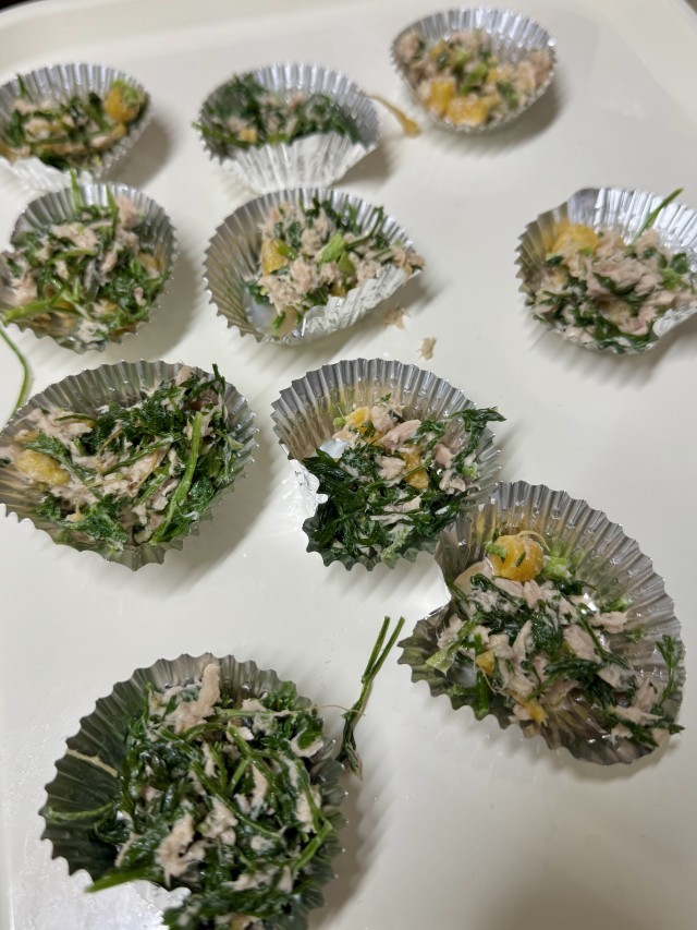 きれいに洗い葉ごと電子レンジで加熱し、ツナと混ぜマヨネーズと塩コショウで味付けしました。