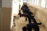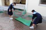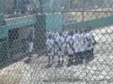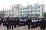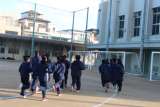 中庭テニスコートから運動場に向かう途中、玄関前に女子ソフトテニス部が集まってい...