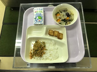 本日のメニューは、ごはん、牛乳、鶏肉とじゃがいもの煮もの、あつあげのしょうゆだれかけ、紅ざけそぼろでした。