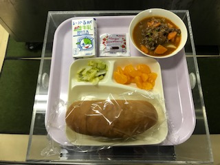 本日のメニューは、牛乳、コッペパン、ビーフシチュー、キャベツのピクルス、みかんでした。