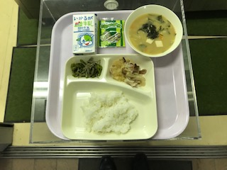 4月17日のメニューは、牛乳、ごはん、豚肉のおろし醤油かけ、味噌汁、じゃこピーマン、抹茶大豆でした、