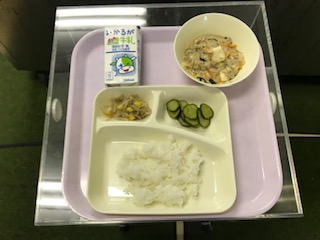 本日のメニューは、牛乳、ご飯、マーボードーフ、きゅうりの甘酢漬け、もやしとコーンのゴマ炒めでした。