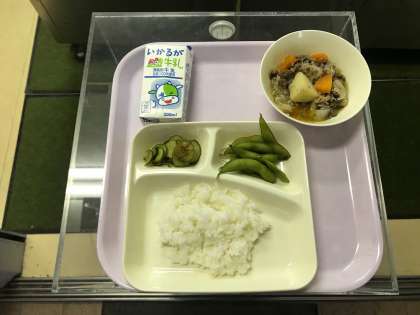 本日のメニューは、牛乳、ご飯、肉じゃが、きゅうりのかつお梅風味、枝豆でした。