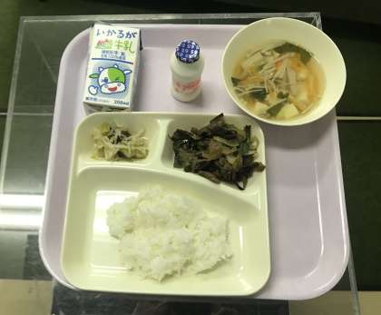 本日のメニューは、牛乳、ご飯、プルコギ、豆腐のスープ、チンゲンサイともやしのゆずの香和えでした。