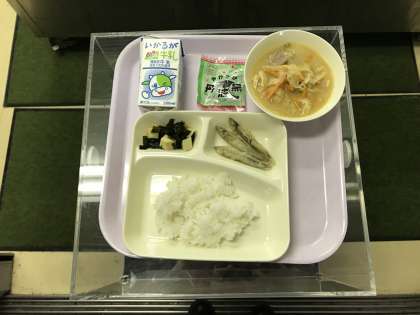 本日のメニューは、牛乳、ご飯、きびなご天ぷら、豚汁、若竹煮、ソフト黒豆でした。