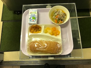 本日のメニューは、牛乳、おさつパン、豚肉と野菜のスープ、変わりピザ、ミックスフルーツでした。