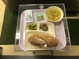 本日のメニューは、牛乳、コッペパン、かつおのガーリック焼き、鶏肉とじゃがいものスープ、グリーンアスパラガスのサラダでした。