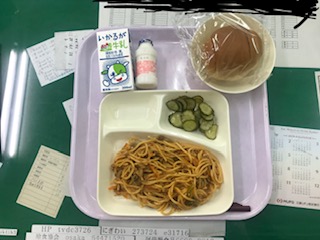 本日のメニューは、牛乳、黒糖パン、スパゲティミートソース、きゅうりのバジルソースサラダ、発酵乳でした。
