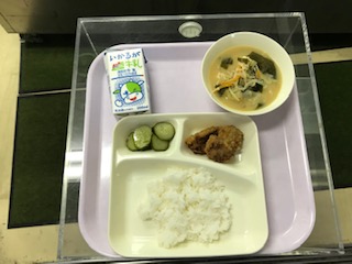 本日のメニューは、牛乳、ご飯、豚肉の香味揚げ、みそ汁、きゅうりの甘酢漬けでした。