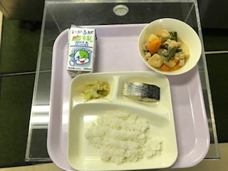 本日のメニューは、牛乳、ごはん、さごしの塩焼き、じゃがいもと一口がんもの煮もの、キャベツのおひたしでした。
