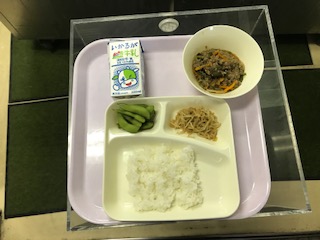 本日のメニューは、牛乳、ごはん、マーボーなす、もやしの胡麻酢あえ、えだまめでした。