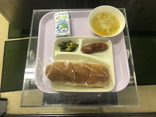 本日のメニューは、牛乳、おさつパン、フランクフルトのケチャップソース、スープ、さんどまめとコーンのサラダでした。