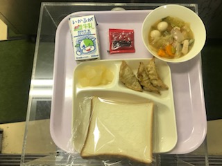 9月12日のメニューは、牛乳、食パン、あげぎょうざ、中華煮、和なしでした。