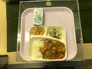 本日のメニューは、牛乳、ハヤシライス、キャベツのひじきドレッシング、さくらんぼでした。