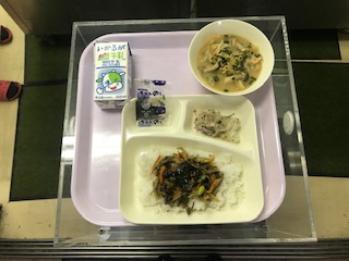 本日のメニューは、牛乳、牛肉のきんぴらちらし、みそ汁、キャベツの赤じそあえでした。