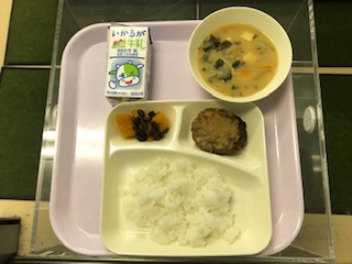 本日のメニューは、牛乳、ご飯、和風おろしハンバーグ、みそ汁、かぼちゃのいとこ煮でした。