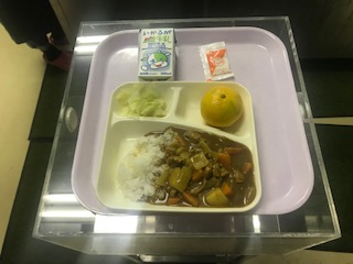 本日のメニューは、牛乳、ポークカレーライス、キャベツのサラダ、みかんでした。