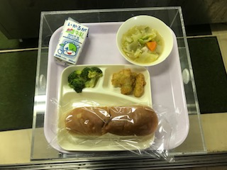 本日のメニューは、牛乳、おさつパン、白身魚のフリッター、スープ煮、ブロッコリーのサラダでした。