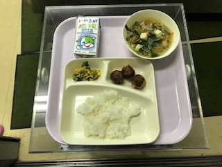 本日のメニューは、牛乳、ご飯、あげシュウマイ、とうふのスープ、ツナとチンゲンサイの炒めものでした。