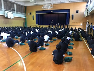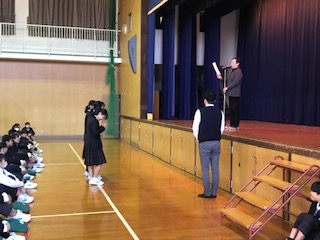 本日全校集会がありました。校長先生から、冬至についてのお話しがありました。また、卓球部女子がブロック大会で、個人戦第2位、ダブルスで、第3位の成績を残し、表彰されました。また、1年生が読書作文コンクールで優秀な成績を収め、表彰されました。