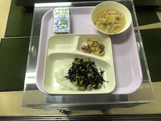 本日のメニューは、牛乳、栄養たっぷり枝豆ひじきご飯、さけのさわやかレモン焼き、冬野菜のみそ汁でした。