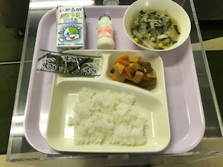 本日のメニューは、牛乳、ご飯、酢豚、中華スープ、焼きのり、発酵乳でした。