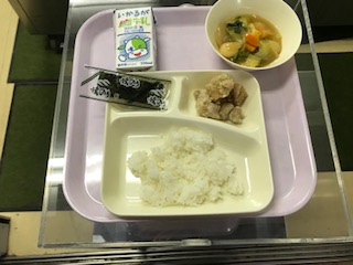 本日のメニューは、牛乳、ご飯、鶏肉のからあげ、まる天と野菜のうま煮、焼きのりでした。