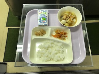 本日のメニューは、牛乳、ご飯、関東煮、もやしとにんじんの甘酢あえ、白花豆の煮物でした。