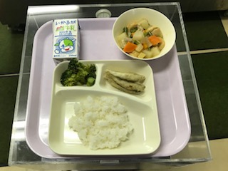 本日のメニューは、牛乳、ご飯、きびなごのてんぷら、一口がんものじゃがいもの煮物、ブロッコリーの胡麻和えでした。