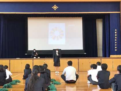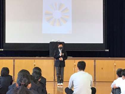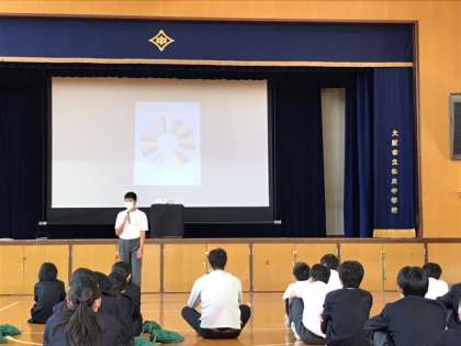 学年集会で、一泊移住の振り返りを行いました。ルーレットで指名された実行委員が1人1分の持ち時間で反省や感想や今後についてなどを、一泊移住にちなんだ一発ギャグなどを交えて順番に話を披露していきました。