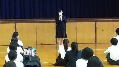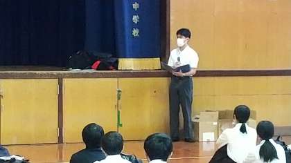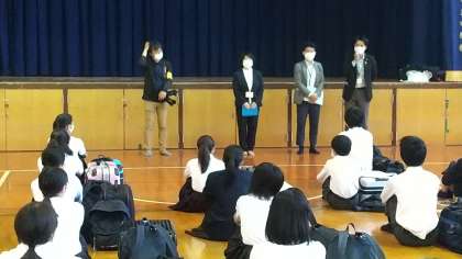 写真は、出発式のようすです。出欠、持ち物等の確認、健康観察、添乗員、写真屋さん紹介のあと、実行委員より諸注意等がありました。
