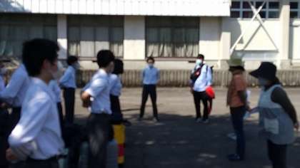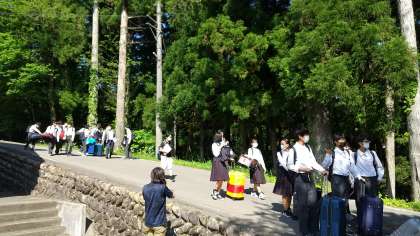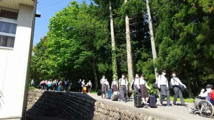 1号車が郡上農山村民泊交流体験、入村式会場に到着しました。学年が18の班に分かれ、民家等で体験活動を行います。
