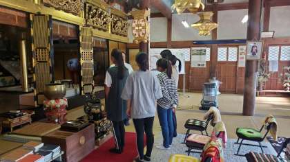 民泊先が、お寺のお家では、講話を聞いたり、お寺の本堂のお掃除体験をします。
