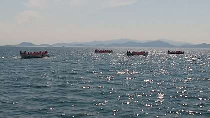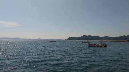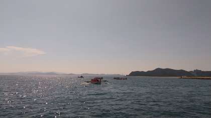 1枚目写真の遠くに鳴門大橋が見えます。その向こう側は徳島県です。海上で小休止しました。
