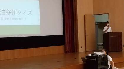 最後は、3組企画「一泊移住クイズ」でした。2択問題がたくさん出され、間違えると脱落していくゲームです。初めは易しい問題でしたが、途中で正解者ゼロになり、全員敗者復活戦、ということになりました。「大阪市と南あわじ市はどちらが大きい?」や「淡路島と琵琶湖はどちらが大きい?」に苦戦しました。