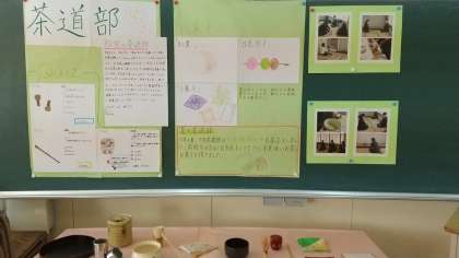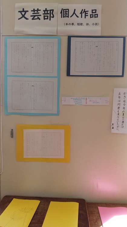 茶道部「お茶道具の展示」(写真下が切れていてすみません)、文芸部「個人製作」です。小説、短歌、本の紹介帯などがありました。