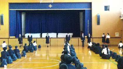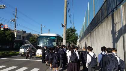 執行部による司会進行のもと、出欠確認、持ち物確認、健康観察、実行委員長からのあいさつなどがありました。その後、バスに乗車、出発しました。