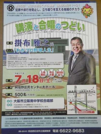 終業式の翌土曜日、午後1時30分より阿倍野区民センター大ホールで行われました。阿倍野区内5中学校の代表が作文で表彰され、掛布雅之氏の講演と阪南中学校の合唱がありました。いつもよりも座席がたくさん用意され、大盛況でした。入賞者の作文は後日、「ひまわり」でご披露予定です。皆さんが作文に思いを込めた、みんなが温かい気持ちで人と接することができれば、明るい社会ができるはず。一人一人が力を出し合いましょう。