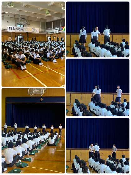 賞状伝達では、書道コンクール、女子バスケットボール部、英語スピーチコンテストの表彰がありました。また、各専門委員会からの報告がありました。