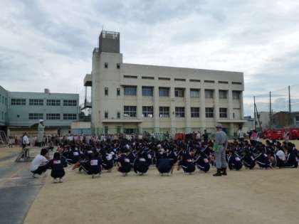 10月5日(土)文化祭の練習後、地震が起こったという想定で、全員が運動場に避難しました。衣斐連合町会長、羽東本部長(阿倍野区長)のご挨拶の後、樋野町会長より説明があり、各学年に分かれて行いました。途中、第1避難所の丸山小学校の児島校長先生も来られました。訓練に参加された地域の方も含め、大所帯となりました。