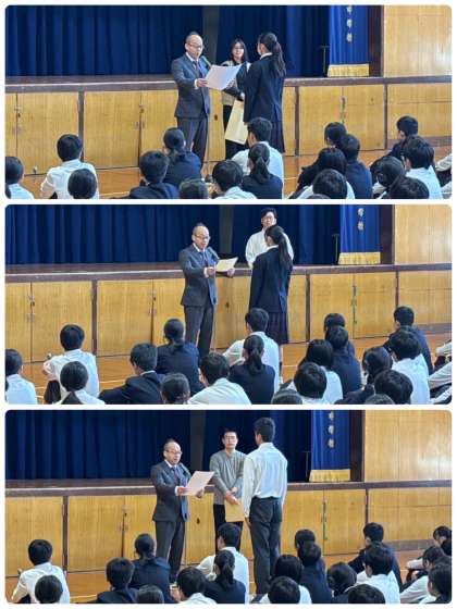絵画コンクール、俳句コンテスト、陸上部の賞状伝達を行いました。