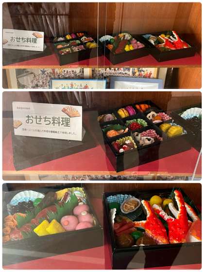 おせち料理、部員一人一人が選んだ料理を樹脂粘土で表現しています。職員室前に展示しています。