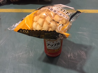 本日(16日)の最終情報です。夜のスタンツ大会も大成功。頑張った後には、お腹が空きます。そこで、夜食にメロンパンとアップルジュースをいただきました。