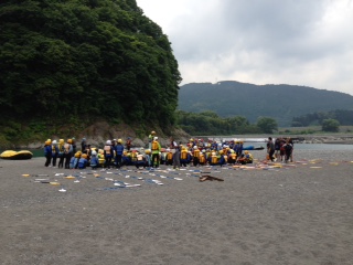 富士川に着き、ラフティングの服装に着替え、安全講習を受けています。さあ、ラフティングの開始です。