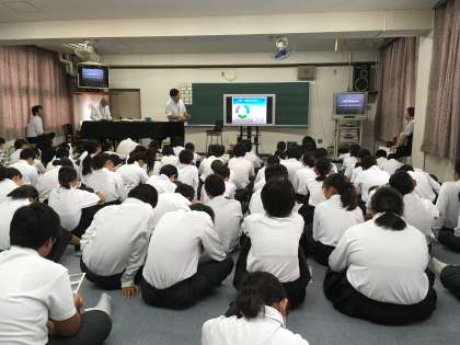 10月14日(月)5時限目、阿倍野区役所企画調整課から4名講師としてお越しいただき、若い世代の人材育成による地域防災力のさらなる向上を目的に、防災研修を実施しました。「幸せを運ぼう」阪神・淡路大震災から学ぶのDVDをを見た後、パワーポイントによる研修を行い、自助・共助の大切さや避難のポイント等を学びました。