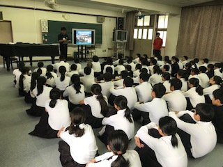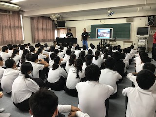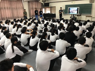 本日6限目に、1年生は音楽室において防災研修を行いました。講師の先生は、阿倍野区役所の防災担当の方にしていただきました。地震の多い日本で、自分の身の守りかたなどをお話しいただき、生徒達は真剣に聞いていました。