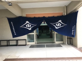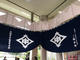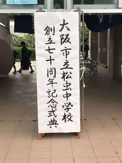 本日、70周年記念式典です。朝早くから生徒も登校しています。玄関の立看板は、書道部の作品です。
