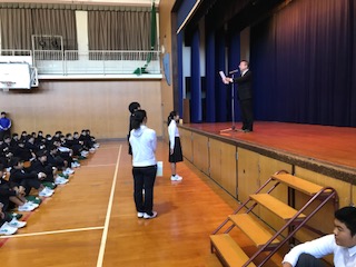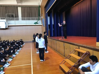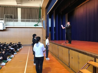 本日、全校集会で卓球部が表彰されました。第8ブロック大会、男子Aリーグ 優勝、女子Aリーグ2位、男女Bリーグ2位の成績を収めました。